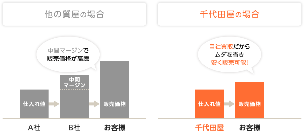 千代田屋は、中間マージンを極限まで削る事によりお客さまへできる限りお安く商品をご提供しています。